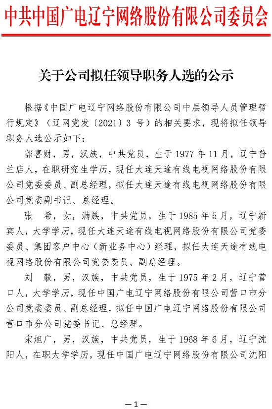 中國(guó)廣電遼寧網(wǎng)絡(luò)股份有限公司(簡(jiǎn)稱(chēng)中國(guó)廣電遼寧公司)前身為成立于2010年2月的北方聯(lián)合廣播電視網(wǎng)絡(luò)股份有限公司,系中央國(guó)有文化企業(yè)——中國(guó)廣電網(wǎng)絡(luò)股份有限公司省級(jí)子公司、遼寧省國(guó)有文化高新技術(shù)企業(yè),是按照現(xiàn)代企業(yè)制度打造的集網(wǎng)絡(luò)建設(shè)、傳輸、運(yùn)營(yíng)及多功能開(kāi)發(fā)與應(yīng)用為一體綜合網(wǎng)絡(luò)運(yùn)營(yíng)商。